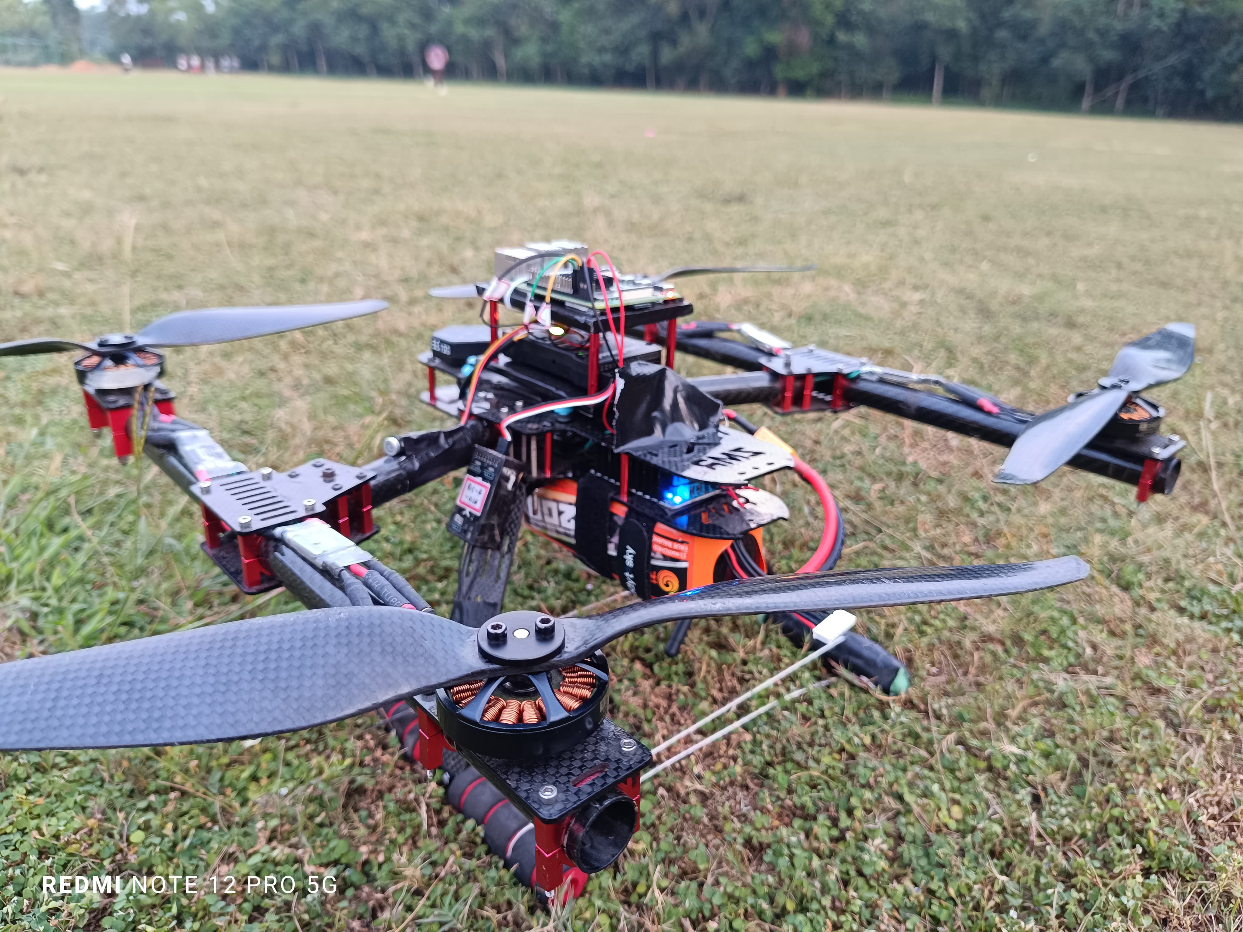 The autonomous drone, weighing approximately 2.5 kg, is configured in an H shape for optimal stability during perimeter surveillance. It employs a Pixhawk flight controller for precise autonomous operations, with Mission Planner serving as the ground control station (GCS). The onboard Raspberry Pi enhances computational capabilities, and the drone is versatile enough for payload dropping.